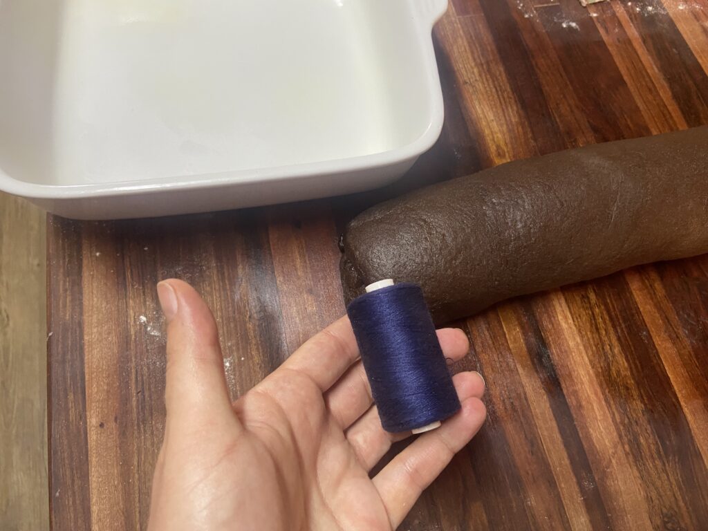 - Use a 40cm piece dental floss or some kind of strong thread. Mark your roll into 9 pieces where you want to cut it and take the thread from under the log twist it on top and pull tight, so you will end up with a nice and clean cut.